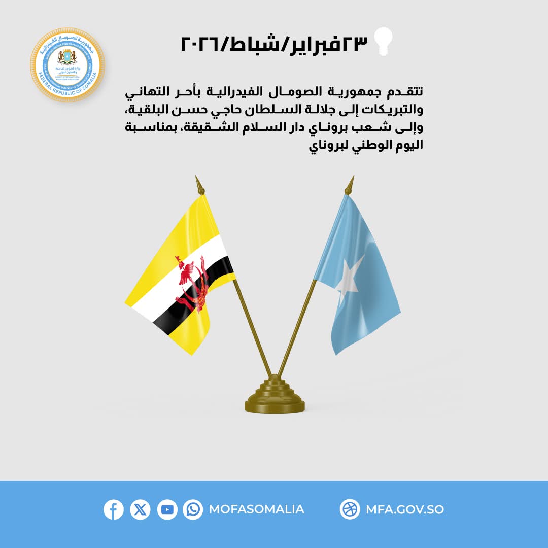 مقديشو- قراءات صومالية- تتقدم جمهورية الصومال الفيدرالية بأصدق التهاني وأطيب التبريكات إلى جلالة السلطان حسن البلقية، وإلى حكومة وشعب بروناي دار السلام الشقيقة، بمناسبة اليوم الوطني لبلادهم.