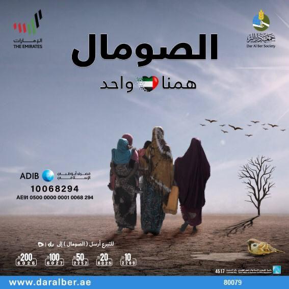 وأعلنت «دار البر» أن حملة الإغاثة العاجلة ستستمر لمدة أسبوعين بدءاً من أمس وتستهدف جمع تبرعات ودعم لصالح المنكوبين من الشعب الصومالي، بقيمة إجمالية تصل إلى 10 ملايين درهم، من المحسنين وأهل الخير والمؤسسات العامة والخاصة، تحت إشراف ومتابعة دائرة الشؤون والعمل الخيري في دبي.