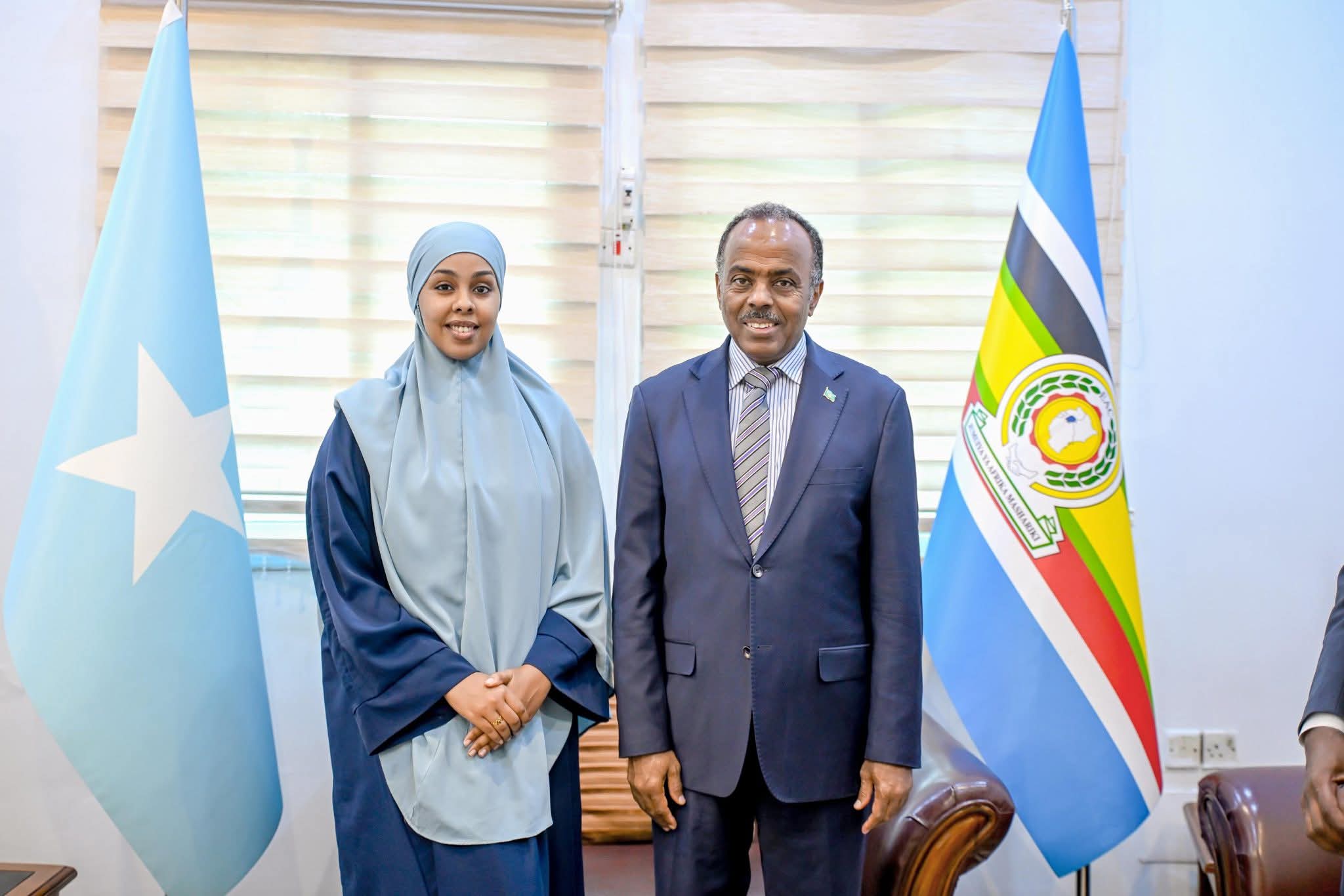 مقديشو –قراءات صومالية- استقبل السيد/ علي محمد عمر، وزير الدولة بوزارة الخارجية والتعاون الدولي في الحكومة الفيدرالية الصومالية، بمكتبه اليوم، شابين صوماليين مبدعين هما عبد الناصر عبد القادر محمد وعائشة عثمان إيكو، وذلك عقب فوزهما في مسابقة جوائز شرق أفريقيا للشباب التي استضافتها مدينة أروشا في تنزانيا.
